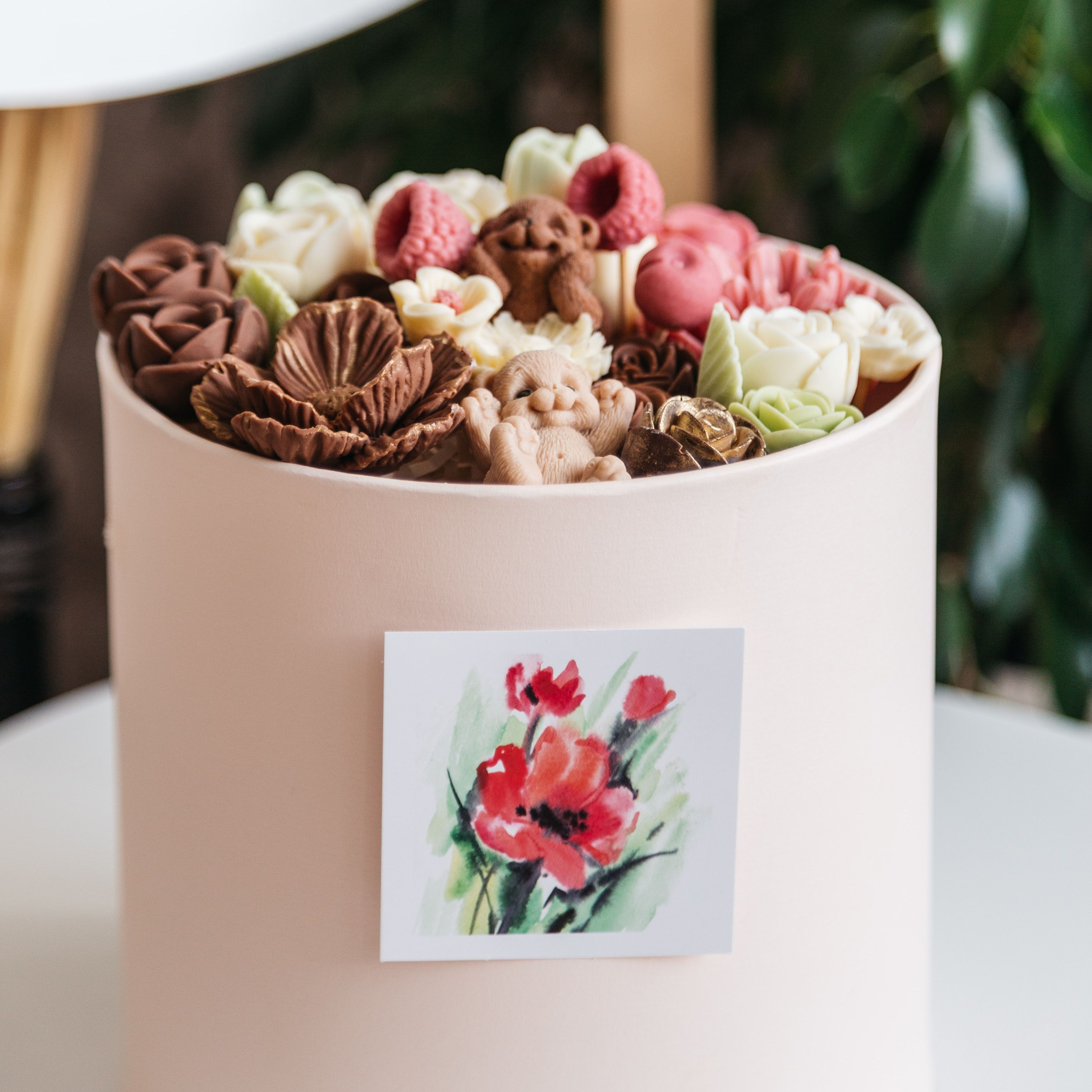 Каждый шоколадный подарок сопровождает открытка с пожеланиями и подарочная лента.