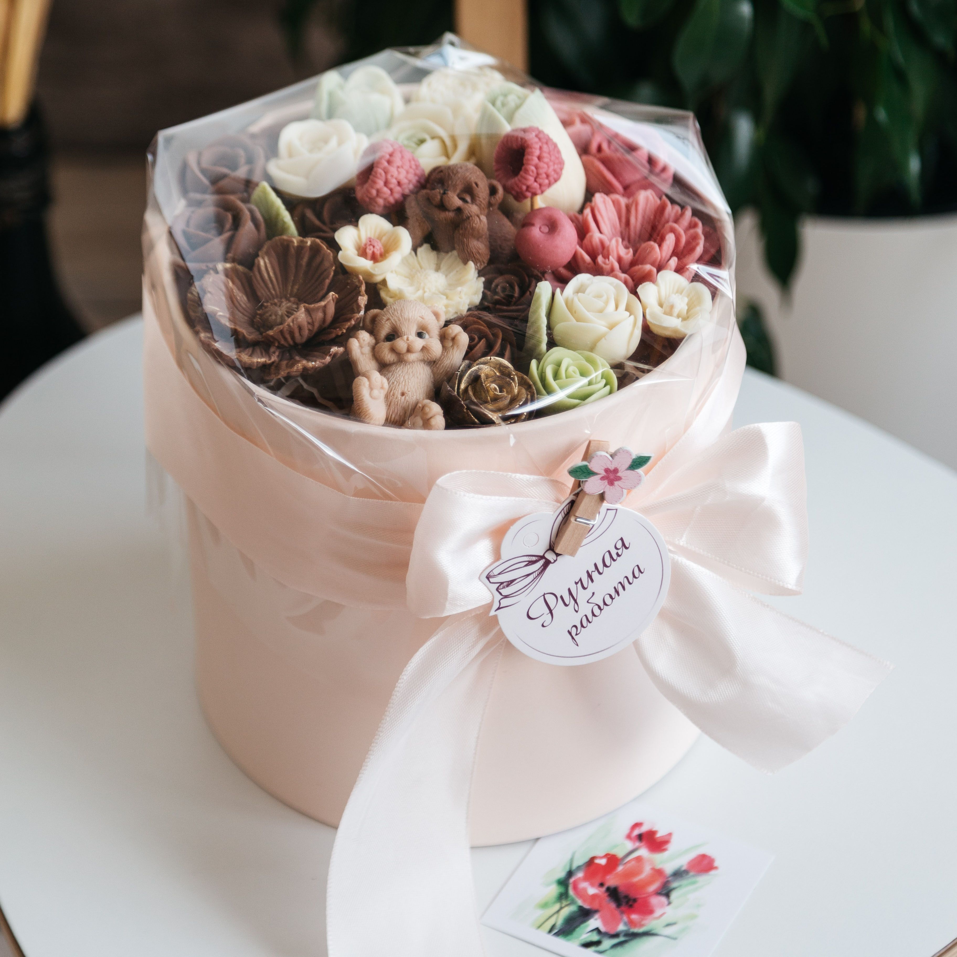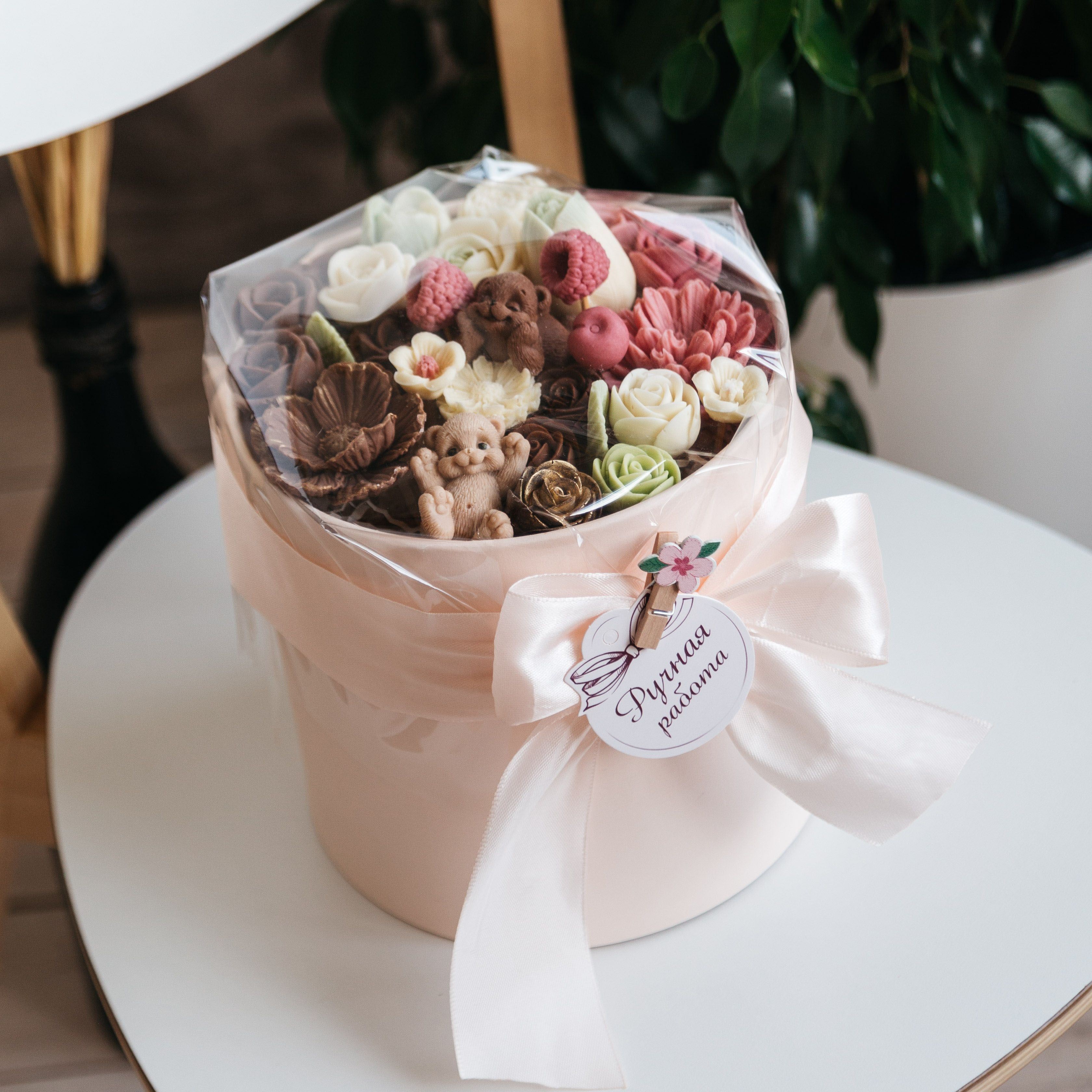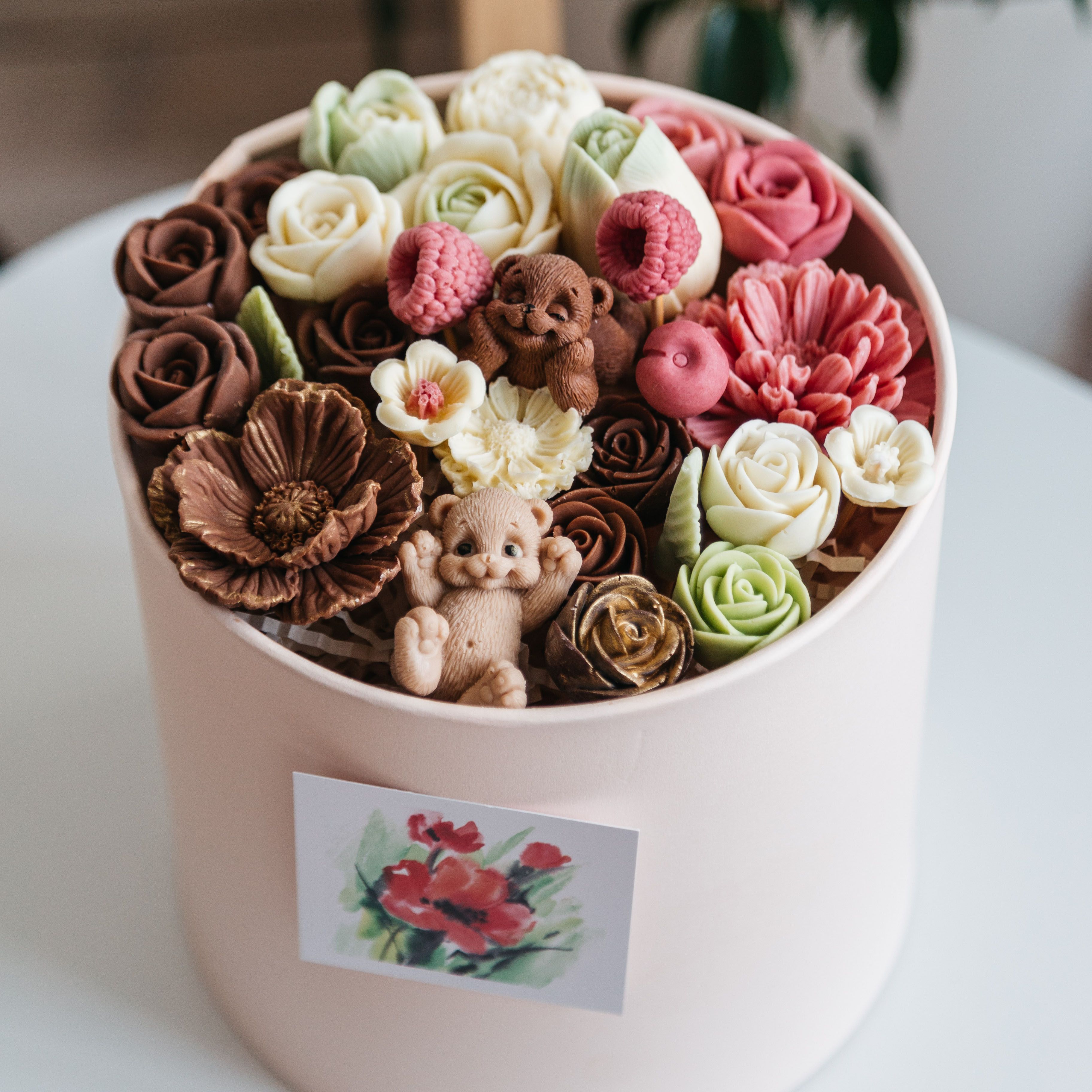 Букет в коробке составлен из разных видов цветов: розы, тюльпаны, ромашки, ягоды вишни и малины. А так же в состав шоколадной композиции входят фигурки мишки.