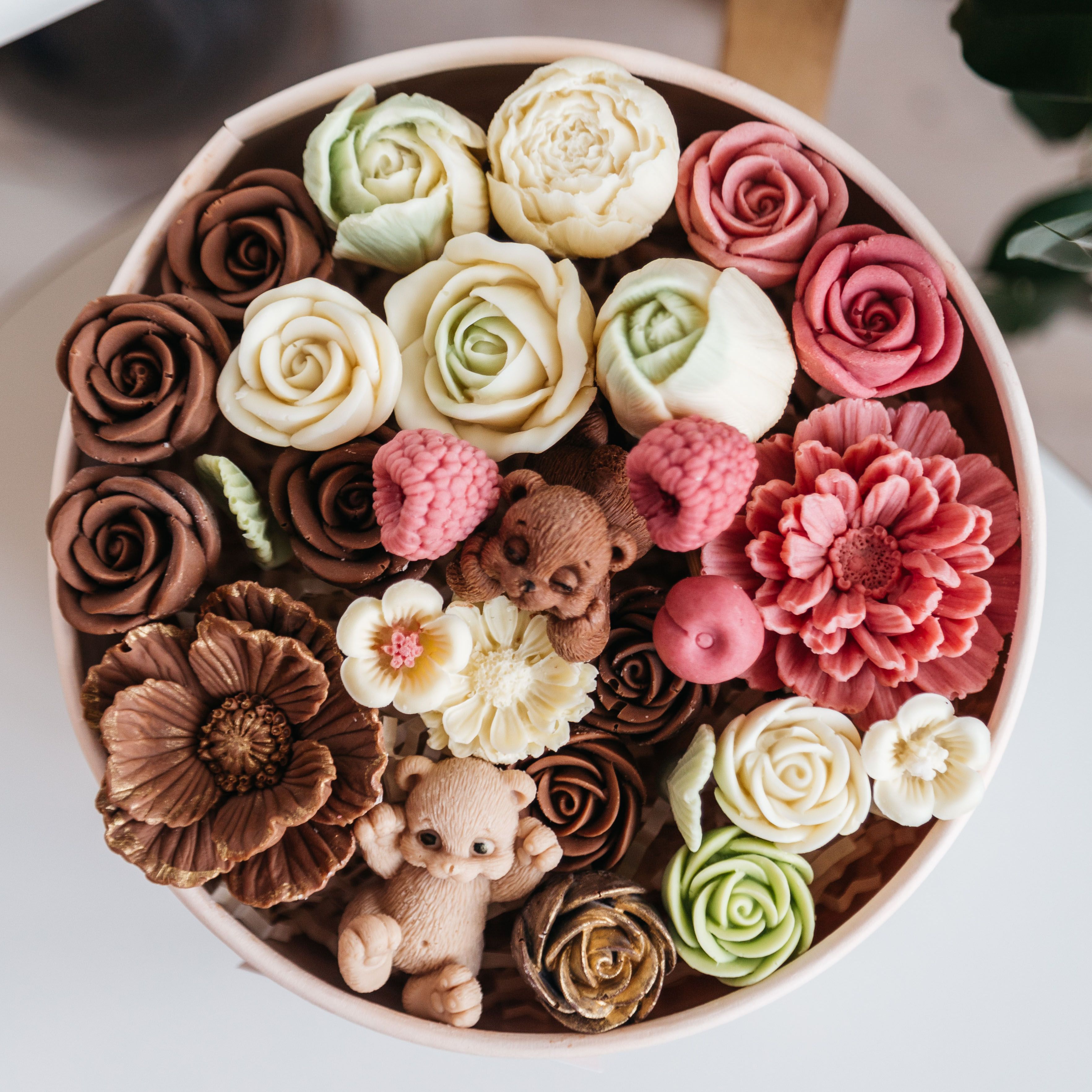 А плотная упаковка с плёнкой надёжно сохранит форму цветов и незабываемый запах и вкус шоколада.