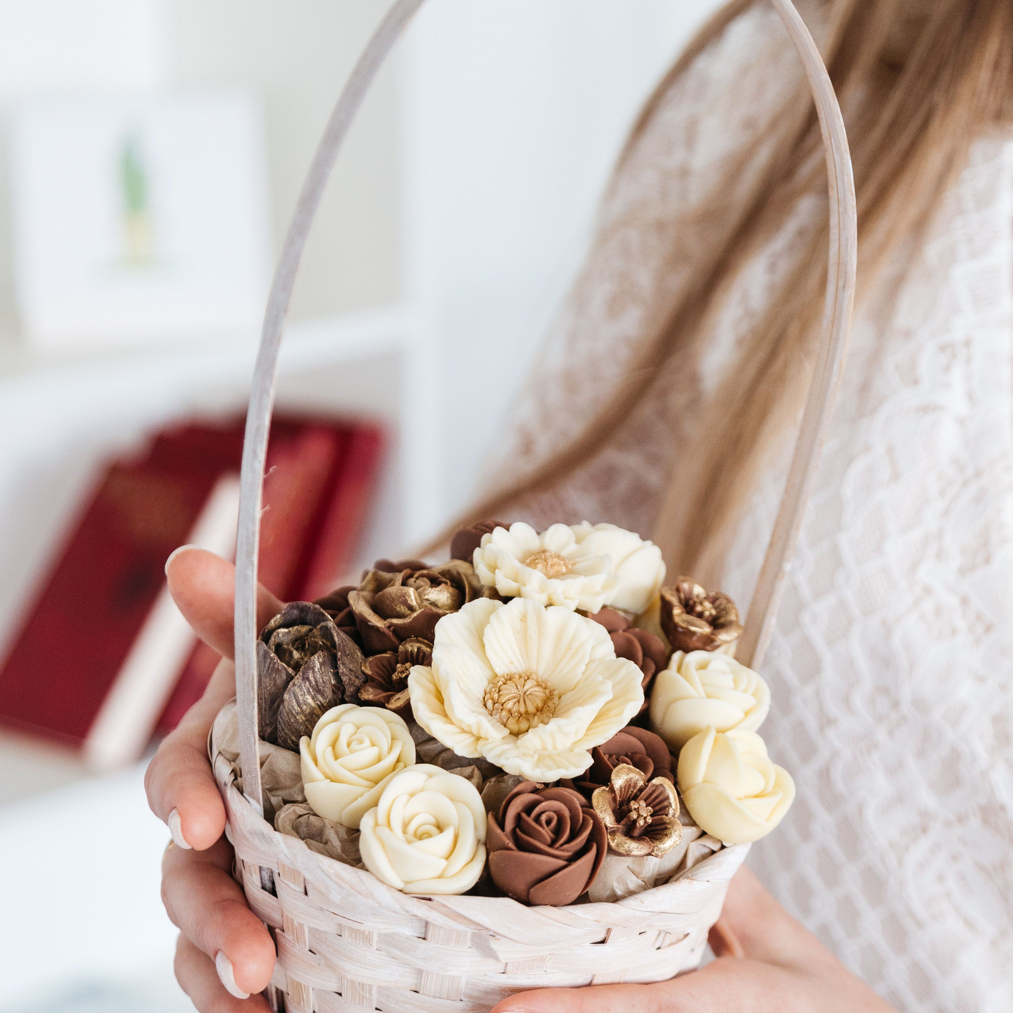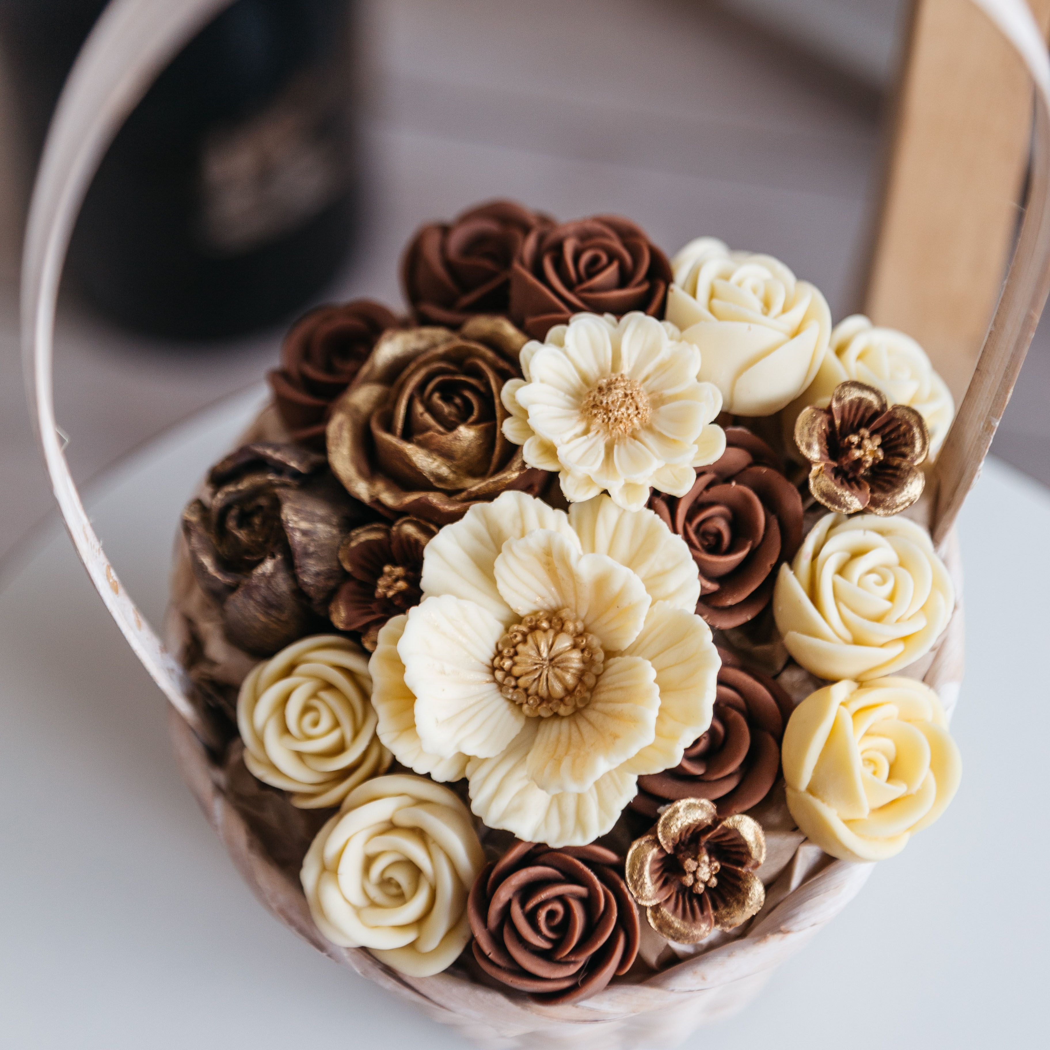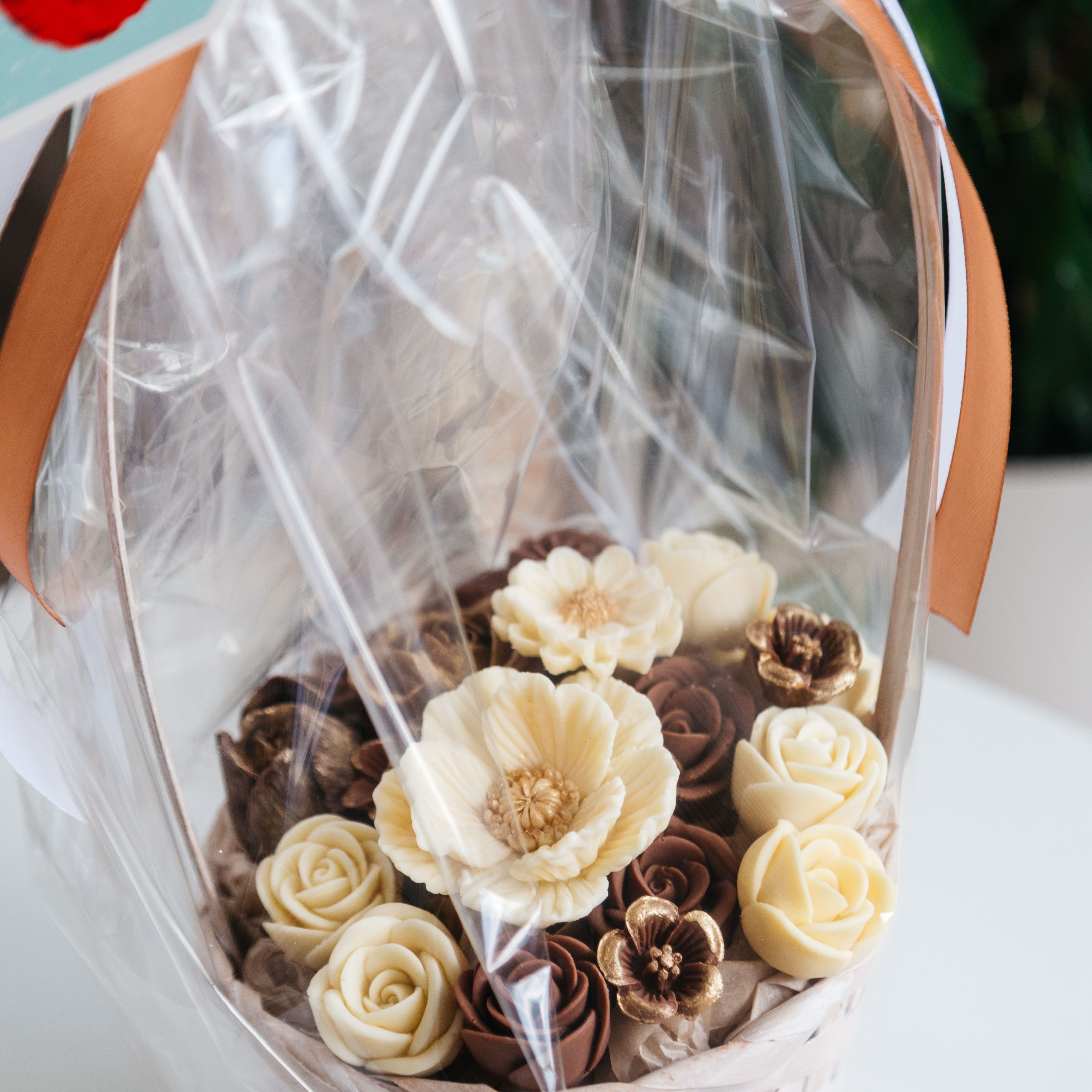 Разнообразие цветов даёт точное сравнение с живым букетом. А плотная упаковка надёжно сохранит форму цветов и незабываемый запах и вкус шоколада.