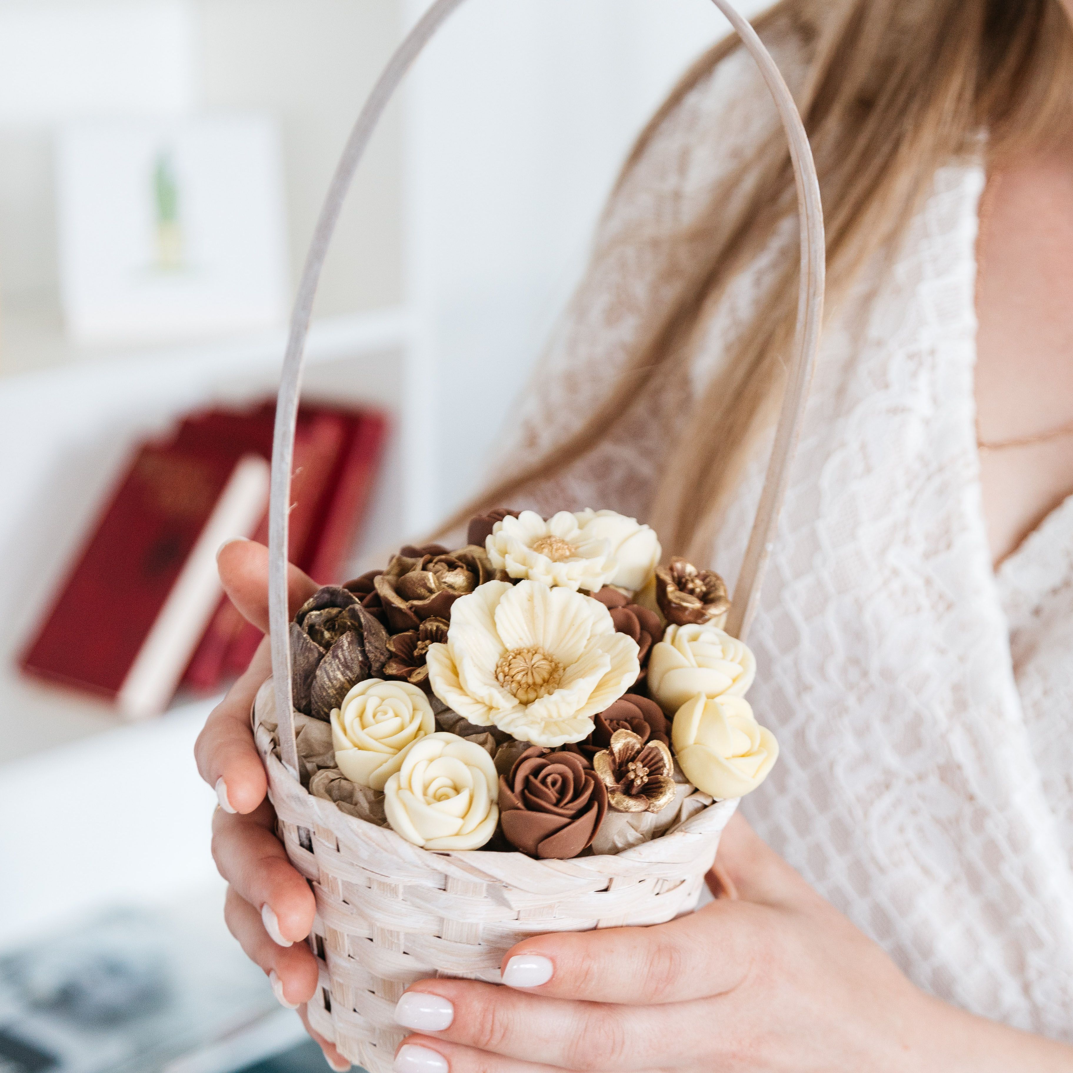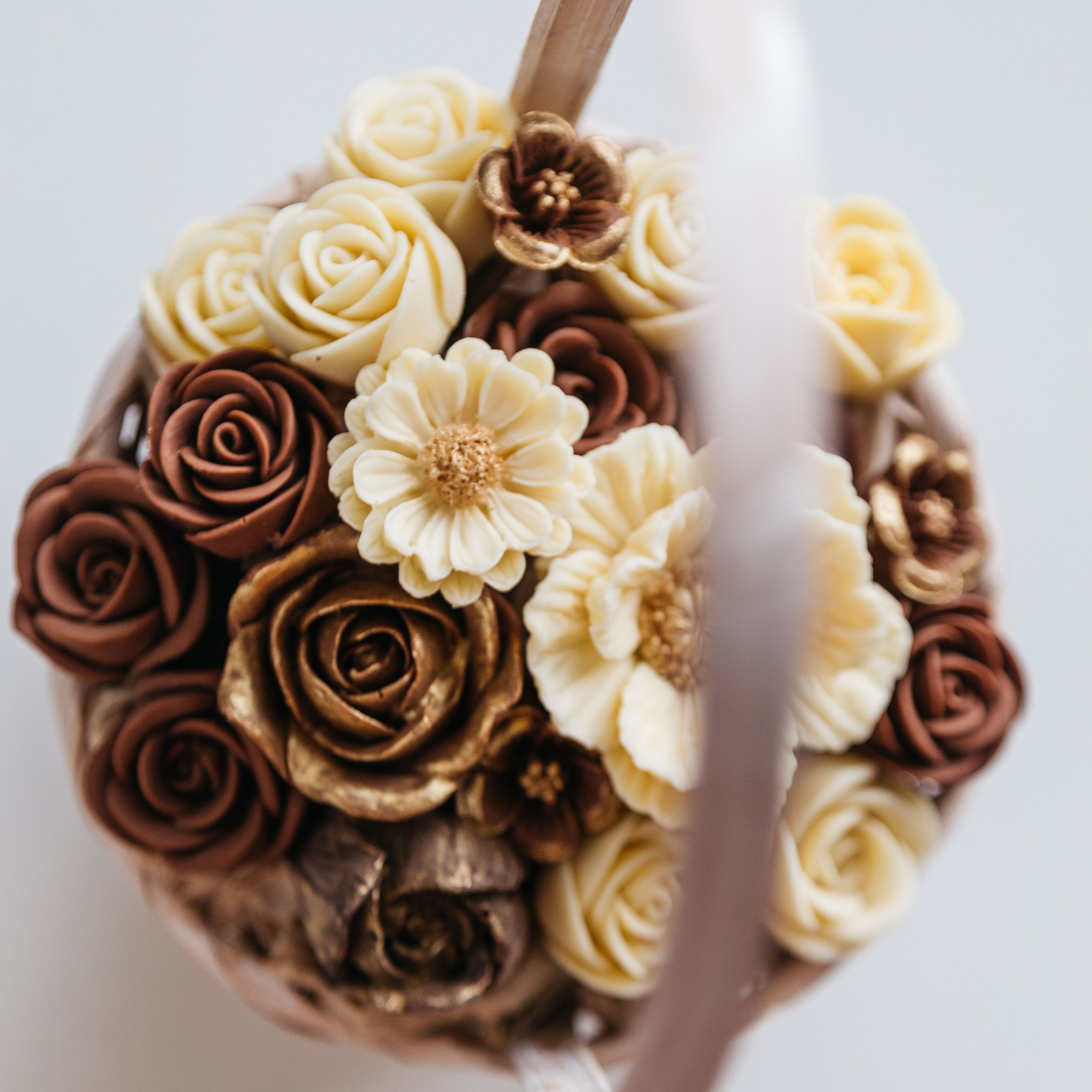 Букет из шоколадных цветов изготовлен из натурального бельгийского шоколада Barry Callebaut: белого, молочного и тёмного. Бутоны из тёмного шоколада окрашены пищевым жирорастворимым перламутровым (золотой кондурин) красителем.